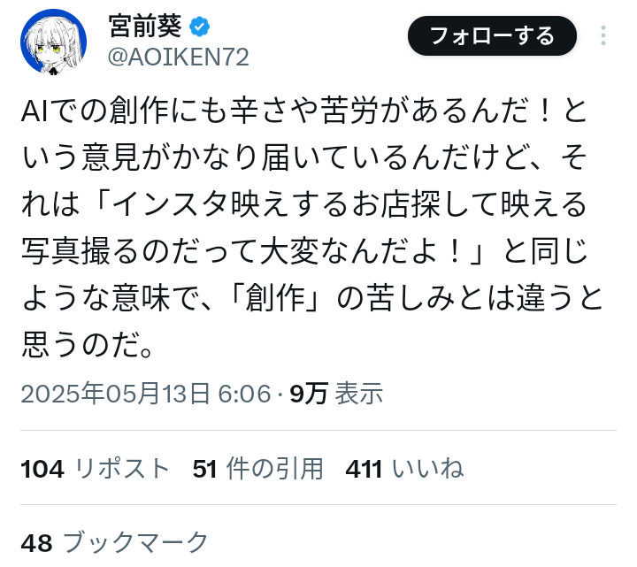 AIが作った音楽とかも普通に数千万とか再生されてるから苦しみとやらは必要ないんやないか