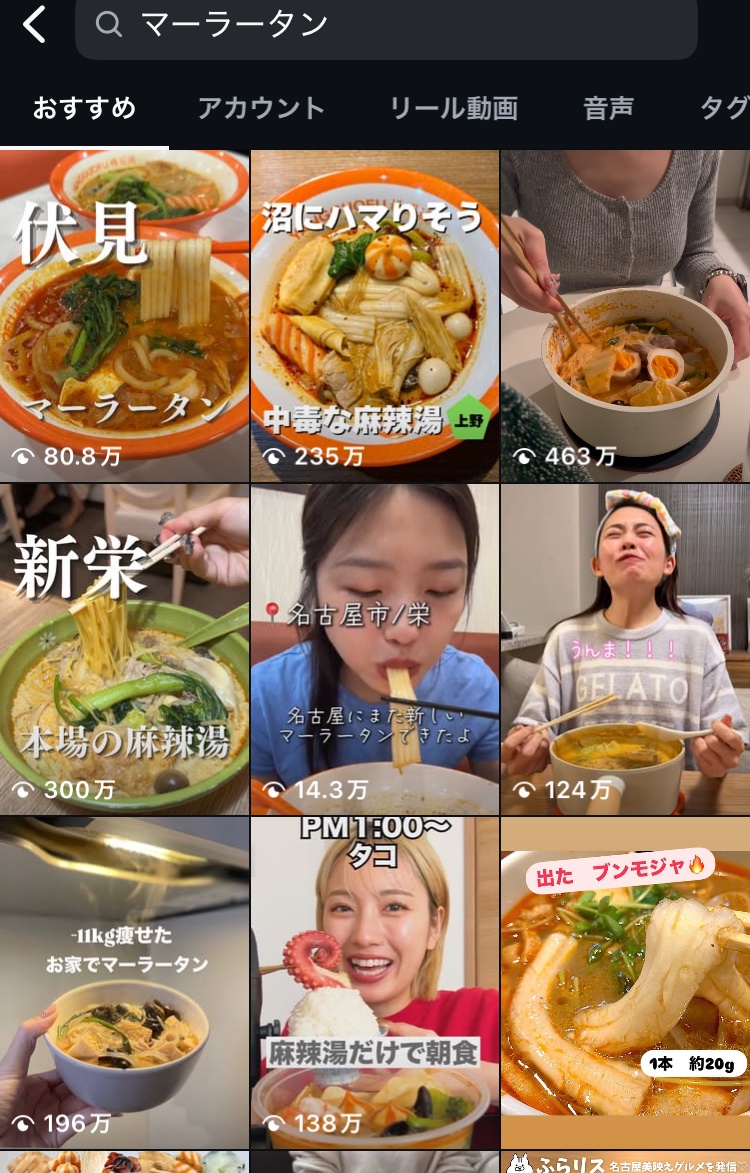 日本の若者の間でマーラータンがブーム化したのは2024年。10~20代の女性TikTokerやインスタグラマー、YouTuberがマーラータンを食べる動画を投稿し始め、注目されるようになった。食レポ動画内で「行列1時間待ちのマーラータンの店に食べに来た!」というような表現をする投稿者も多く、それを見てチェーン店の楊國福や七宝などに通う女性が増える、その様子がSNSで拡散し人気に拍車をかけるという循環になっている。