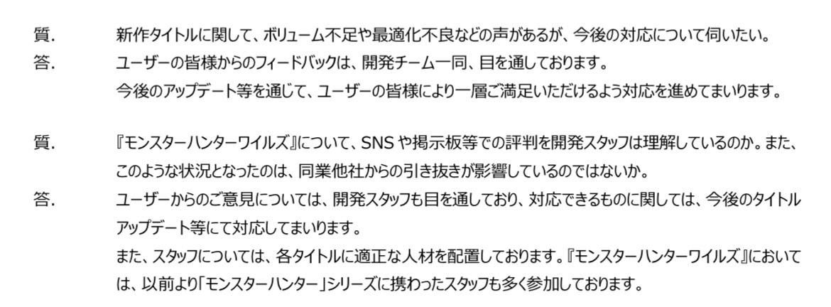 【朗報】カプコン株主総会「モンハンワイルズは適正な人材配置をしておりますのでご安心ください」