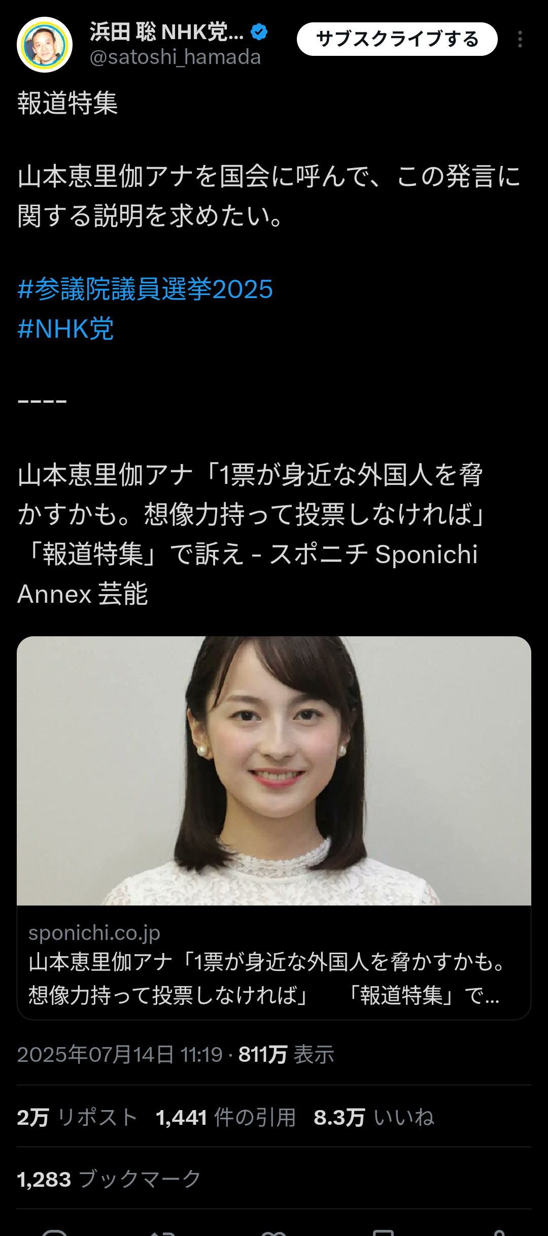 今回別に参政党に投票しなかった俺から見ても明らかに偏向報道だし党の主張を曲解して捻じ曲げて伝えてるしこれは擁護できないわ
