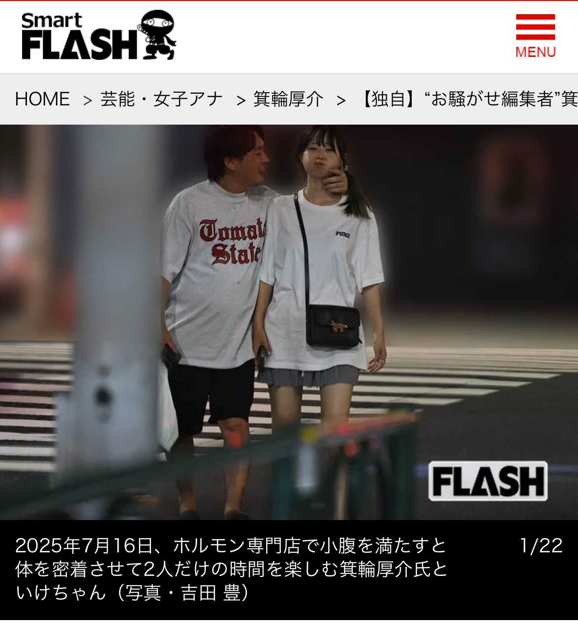 道中、箕輪氏は終始いけちゃんの肩や腰に手をまわし、ふくれっ面をした頬を突っついてみせる。サンダル履きのリラックスした装いは、気を許し合った同棲カップルのようだが、スキンシップの多さが2人の恋の火照りを物語る。この日も、箕輪氏は午前1時半まで滞在し、タクシーに乗り込み、近所の自宅へ帰って行った。