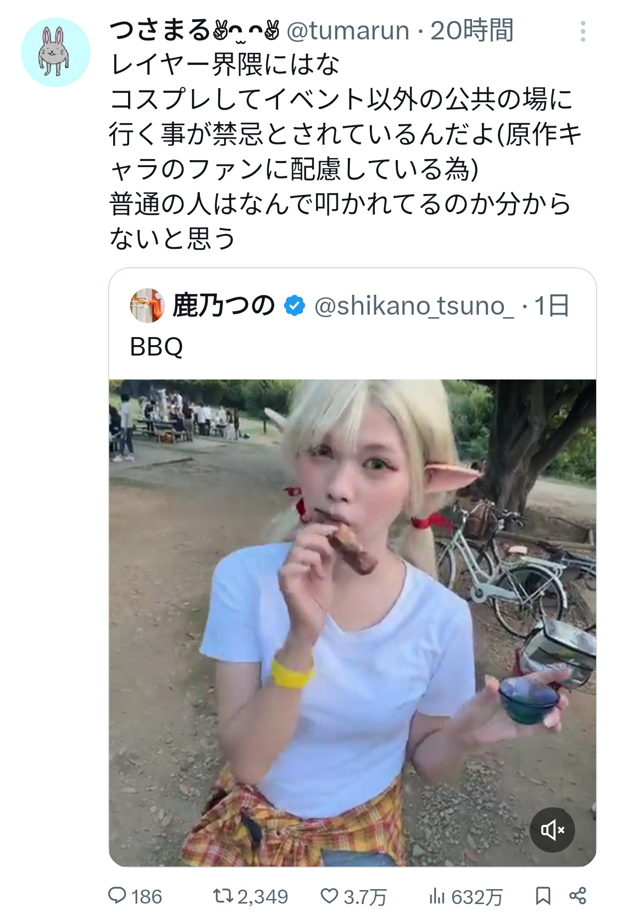 この程度なら賛否分かれるのかもしれんけどBBQ行って露出度高いレイヤー居たら嫌だな