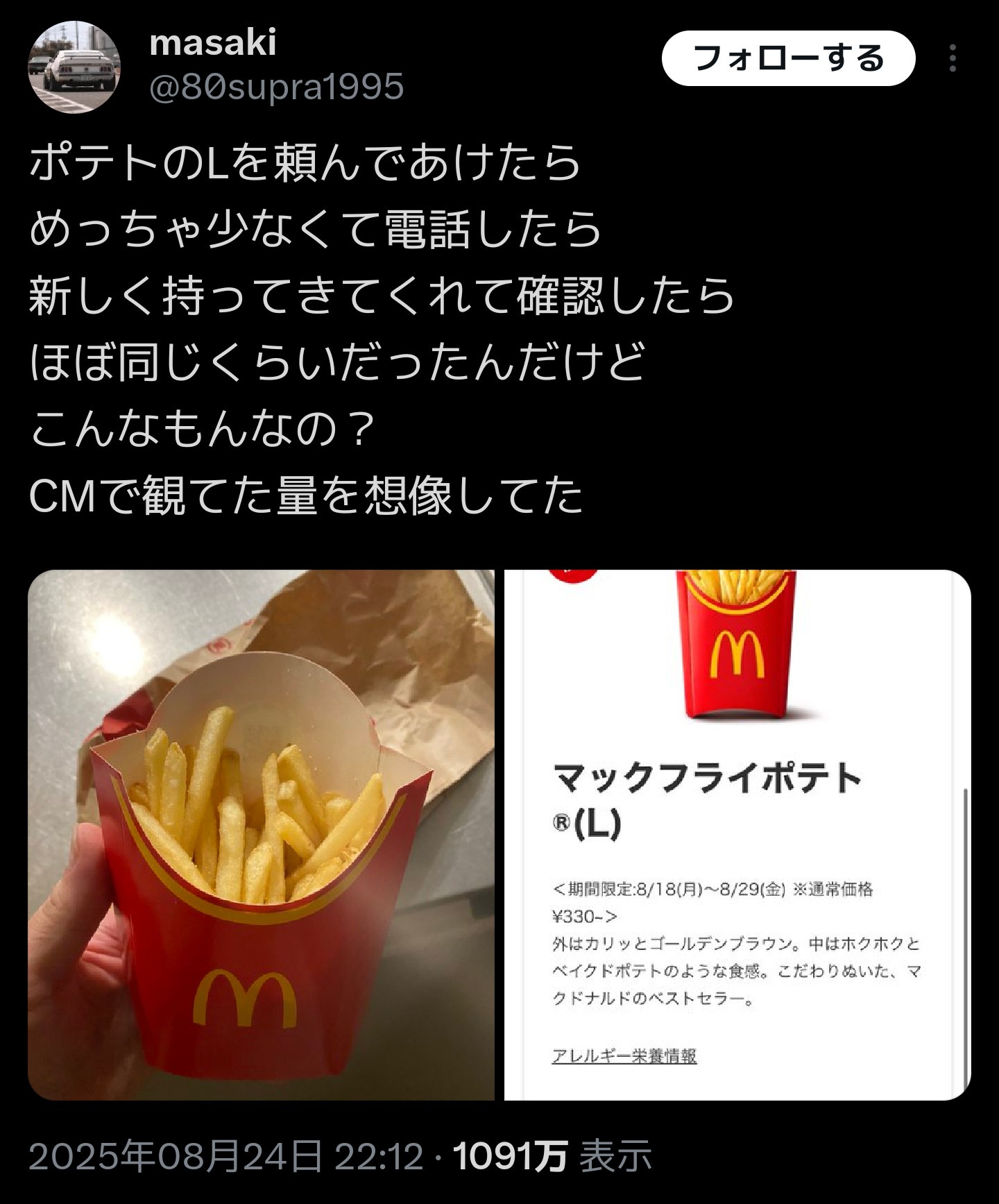 CMでトクにナルドでポテト全サイズ100円とか言っててこれ出されたらそら文句も言うわな