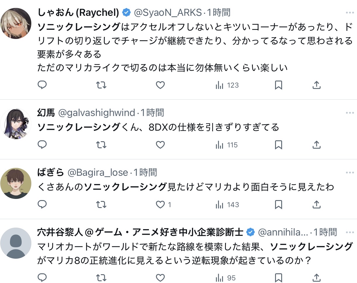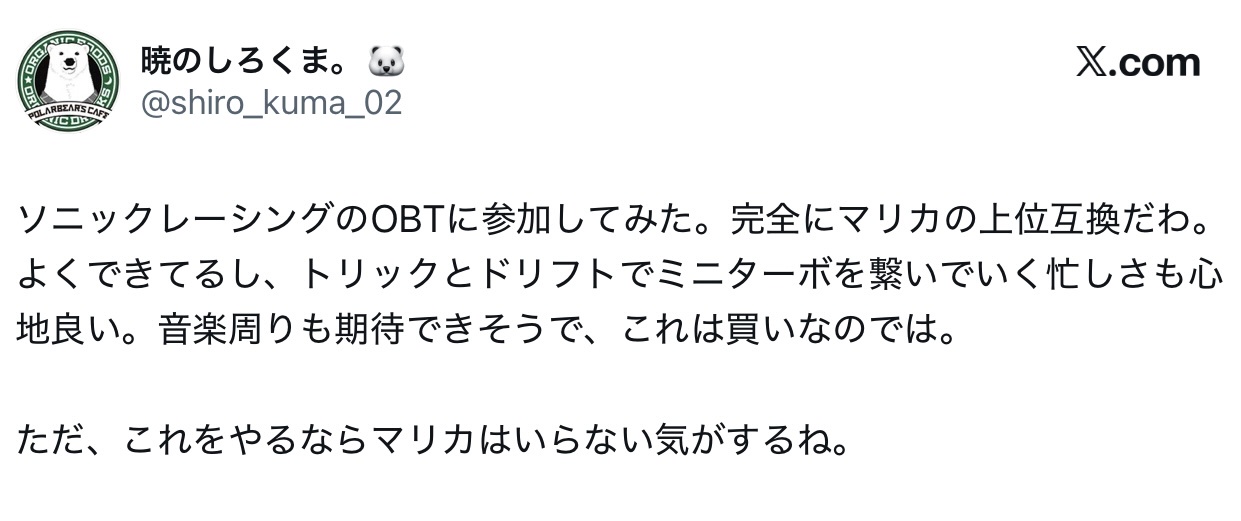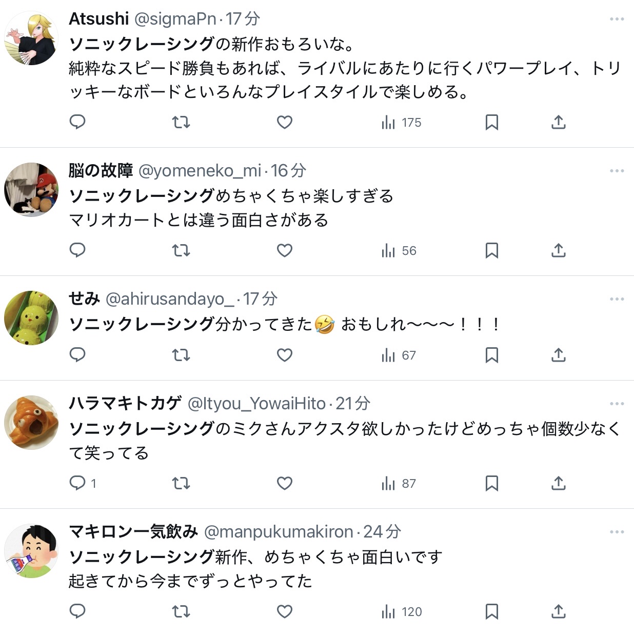 普通にカーブが連続してドリフトミニターボがたくさん撃てるだけで従来のマリカの楽しさを思い出させてくれるわ、めっちゃ楽しいソニックカート