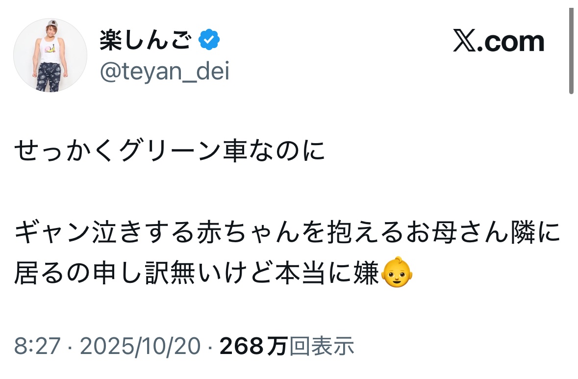 グリーン車乗るような富裕層ママでも赤子のギャン泣きには勝てないんだなって