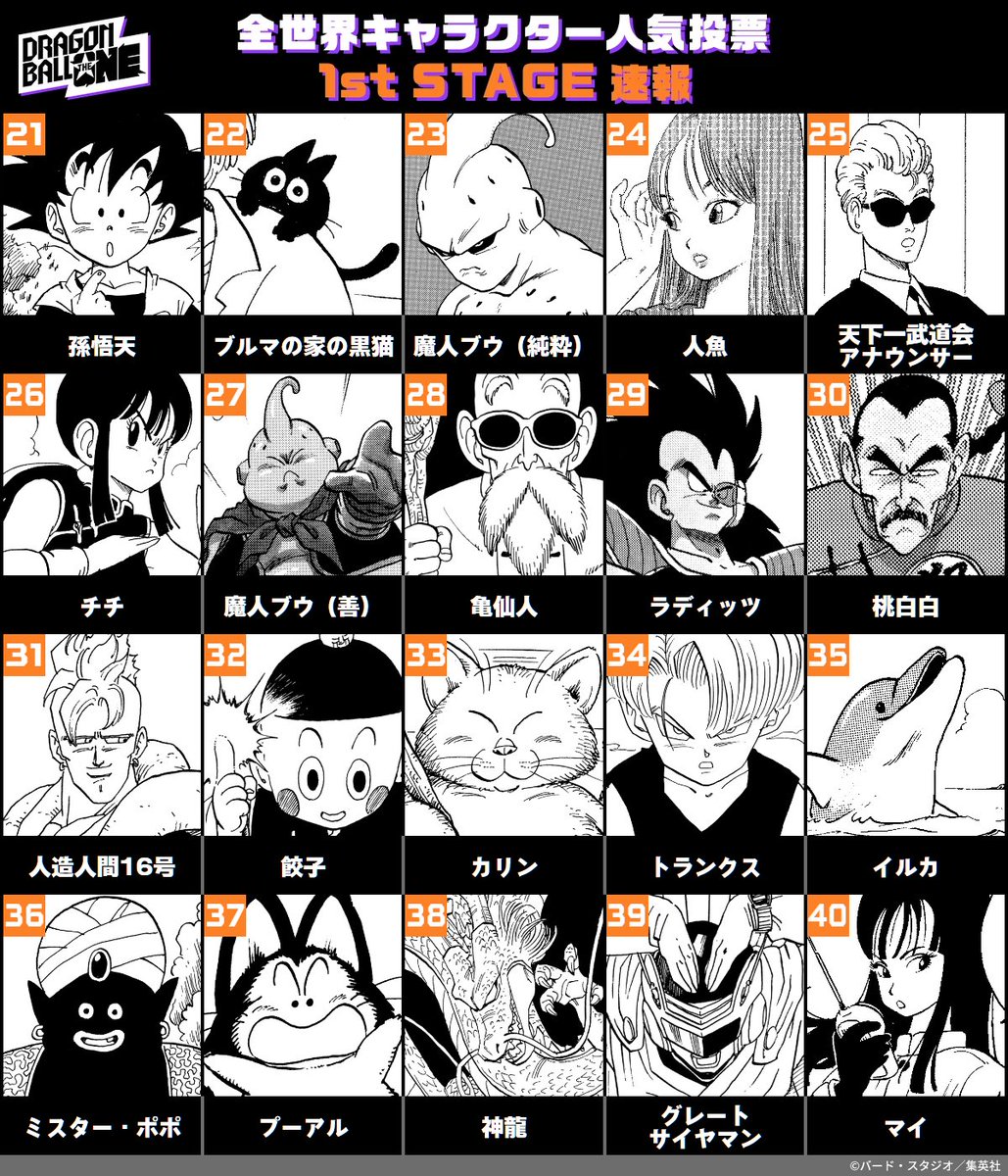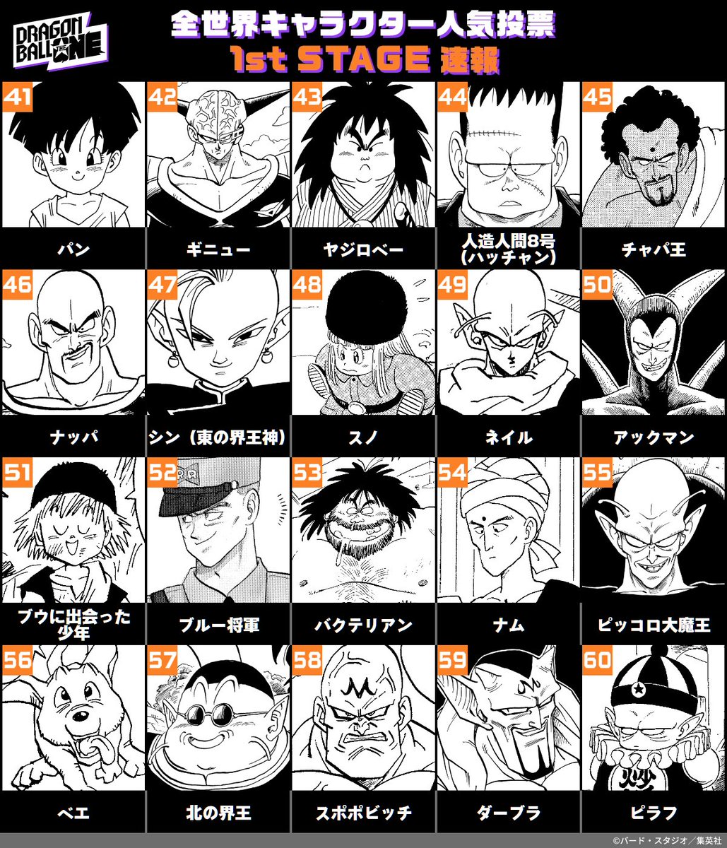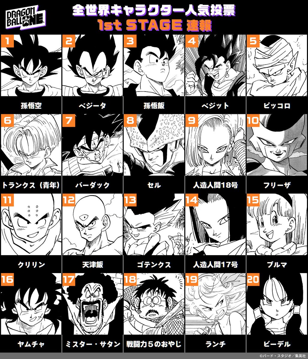 6位はトランクス(青年)、7位はバーダック、8位はセル、9位は人造人間18号、10位はフリーザ。11位にクリリンがランクインしている。1stステージは、24日11時59分まで投票を受け付けている。