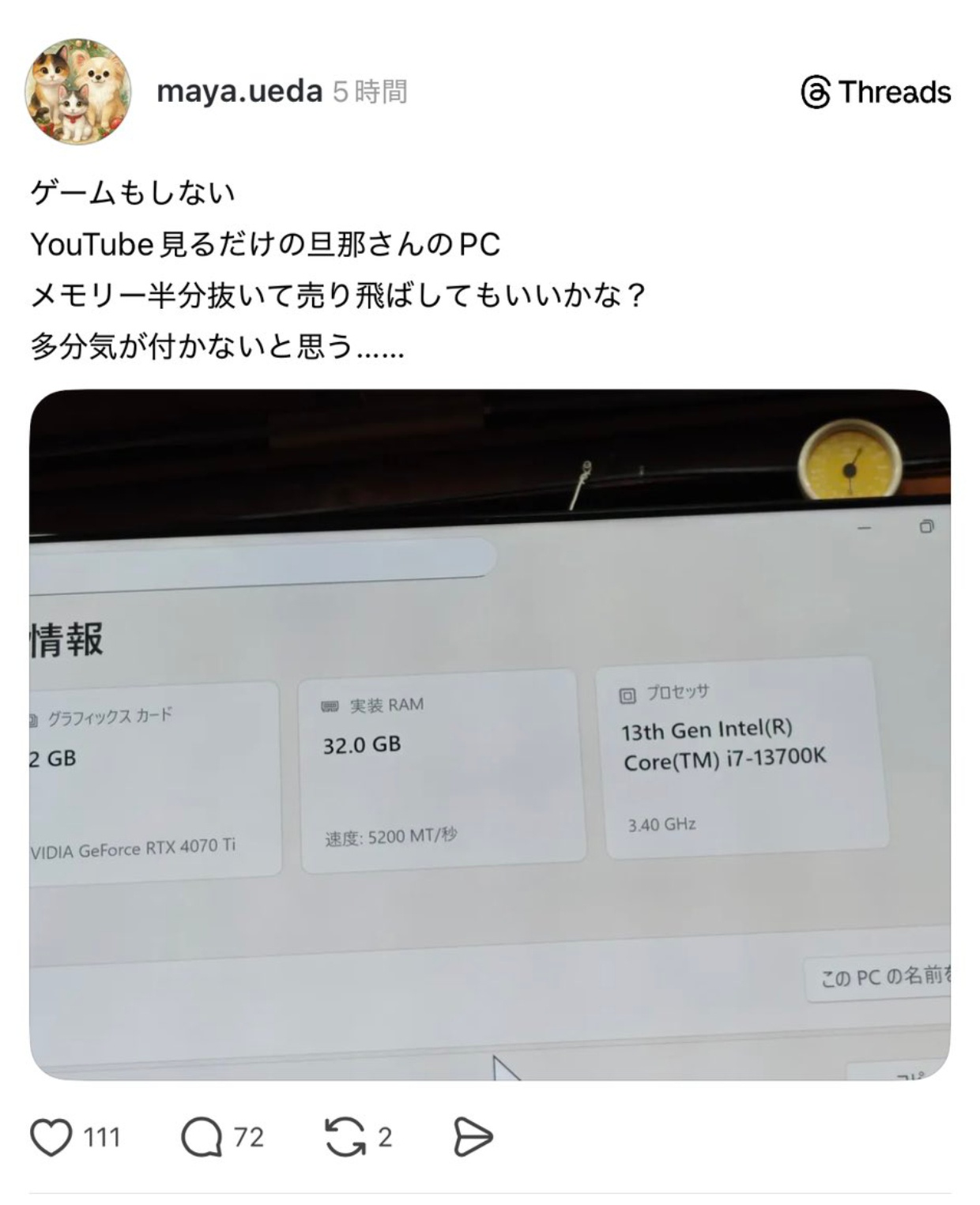 旦那「何かメモリ減ってる!!くそっメモリ高騰してるけど買いなおそ!!」