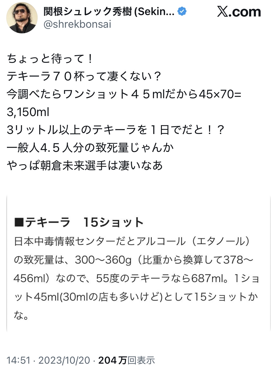 バーテンやってるけど一晩でテキーラ30杯でも相当強い部類