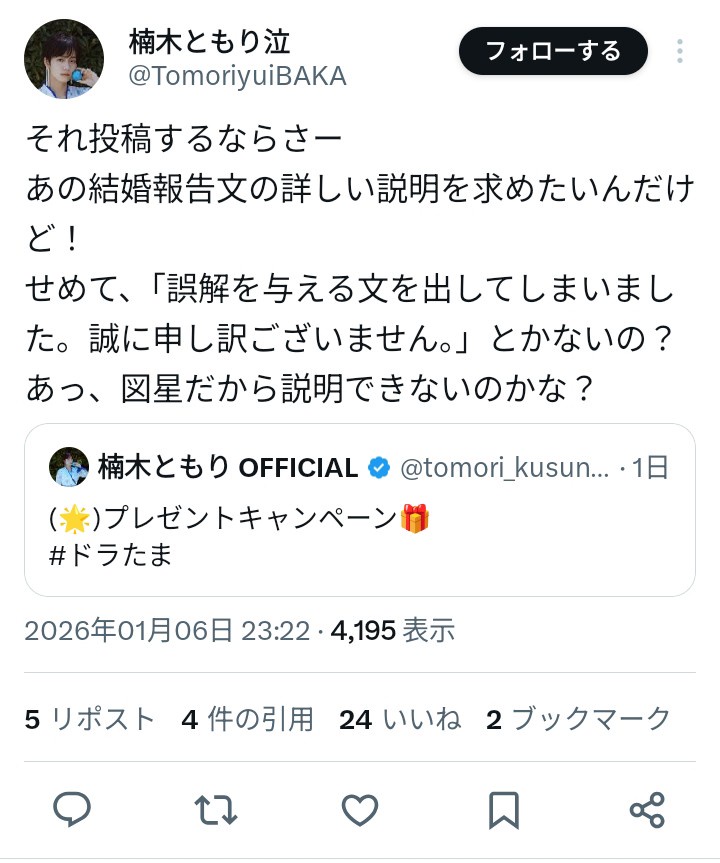 【悲報】声優・楠木ともりさん(26)、結婚したことに対して謝罪を要求されるwwwwww