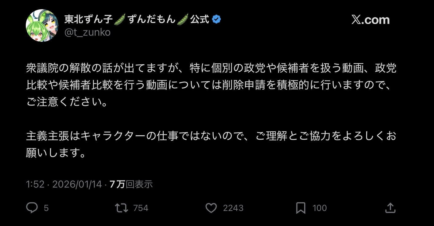 【悲報】ずんだもん公式「特定の政党や候補者の話をさせるな」
