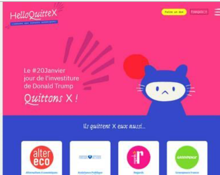 8日に公開されたアプリ「HelloQuitteX」はXの自分のデータを新興SNSのマストドンやブルースカイに移すことでXでフォロー相手だった利用者を自動的に見つけられ、X上のつながりを維持しやすくする。AFP通信によると、アプリの発音が仏語で「ハローキティ」に似ているため、キティちゃんを模したキャラがロゴマークになっている。