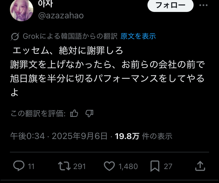 >韓国人「会社の前で旭日旗を真っ二つにしてやる。」