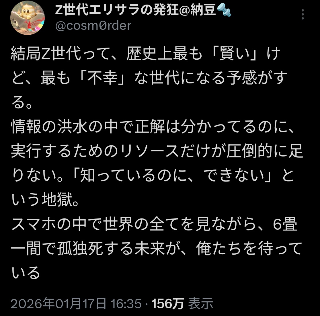 結局Z世代って、歴史上最も「賢い」けど、最も「不幸」な世代になる予感がする。